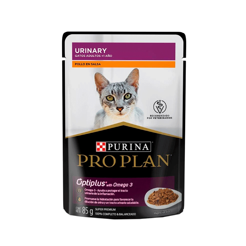 El alimento húmedo urinary de pollo en trozos con salsa en sobre, es un alimento húmedo que combina la nutrición que tu deseas con el sabor que a ellos les encanta. Un alimento 100% completo y balanceado, con deliciosos trozos en salsa y beneficios nutricionales únicos para cada necesidad. Contiene optiplus con Omega 3 que ayudan a proteger el tracto urinario de la inflamación. El alimento húmedo promueve la hidratación para favorecer la dilución de la orina manteniendo un tracto urinario saludable.
